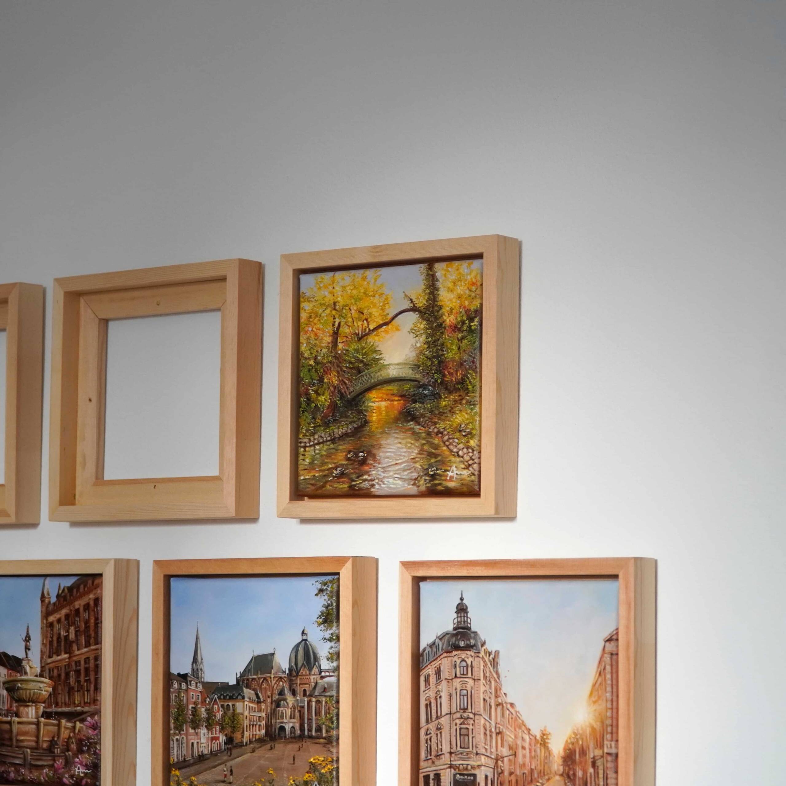 Nach dem abschließenden Firnis wird die Leinwand in einen hochwertigen, naturbelassenen Schattenfugenrahmen eingesetzt. Dank der praktischen Zackenaufhängung kannst du das Kunstwerk direkt z.B. in deinem Wohnzimmer, Flur oder Schlafzimmer anbringen – und dir so ein Stück aus dem wunderschönen Aachen nach Hause holen.