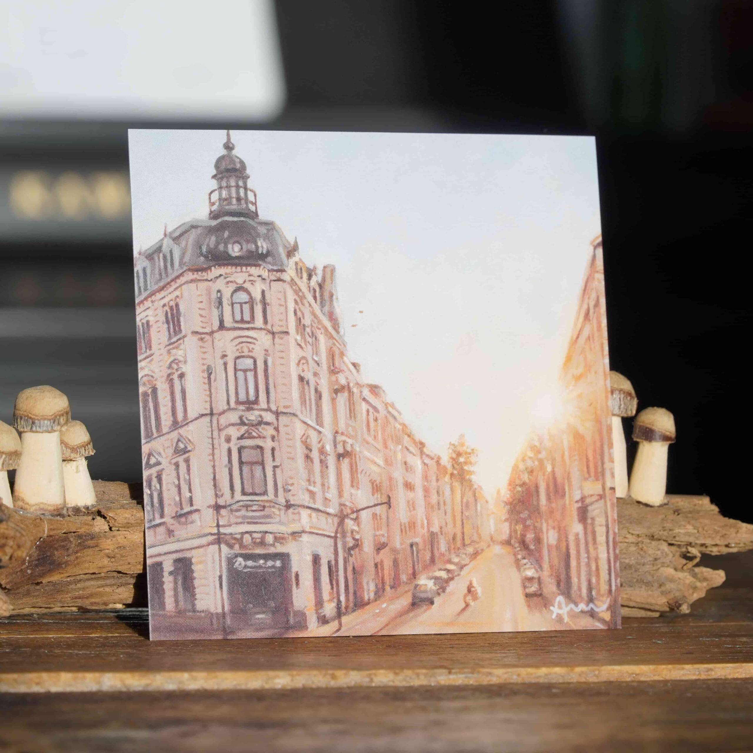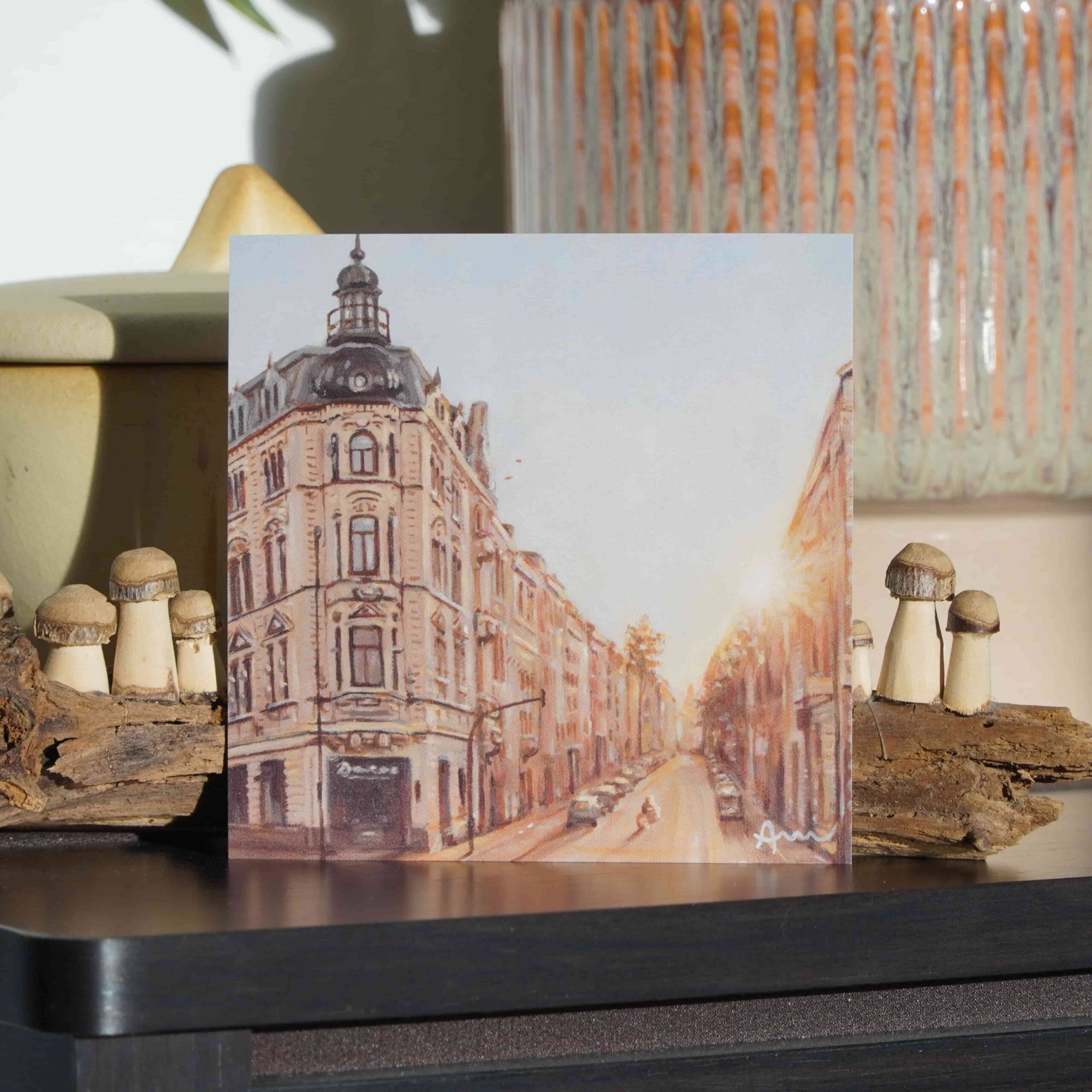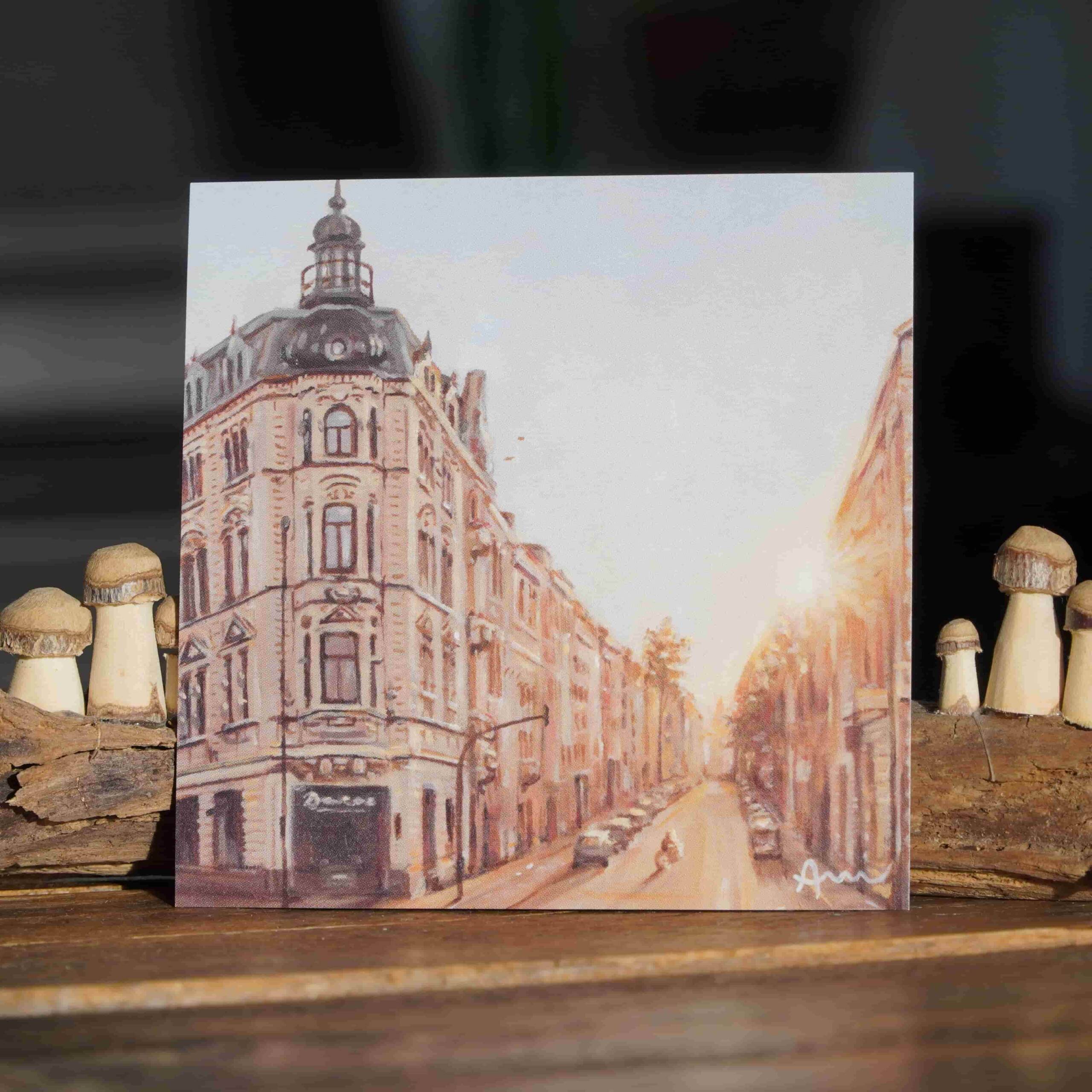 Diese süße, kleine Kunstkarte zeigt meine liebste Straßenecke im Frankenberger Viertel von Aachen: die Oppenhoffallee – eine Gegend voller historischer Wohnhäuser, eleganter Fassaden und innenstadt Flair. Dieses Motiv in Anlehnung an das originale Gemälde ist als kleine hochwertige Karte auf 400 g/m² Premiumkarton gedruckt mit seidenmatter Oberfläche.